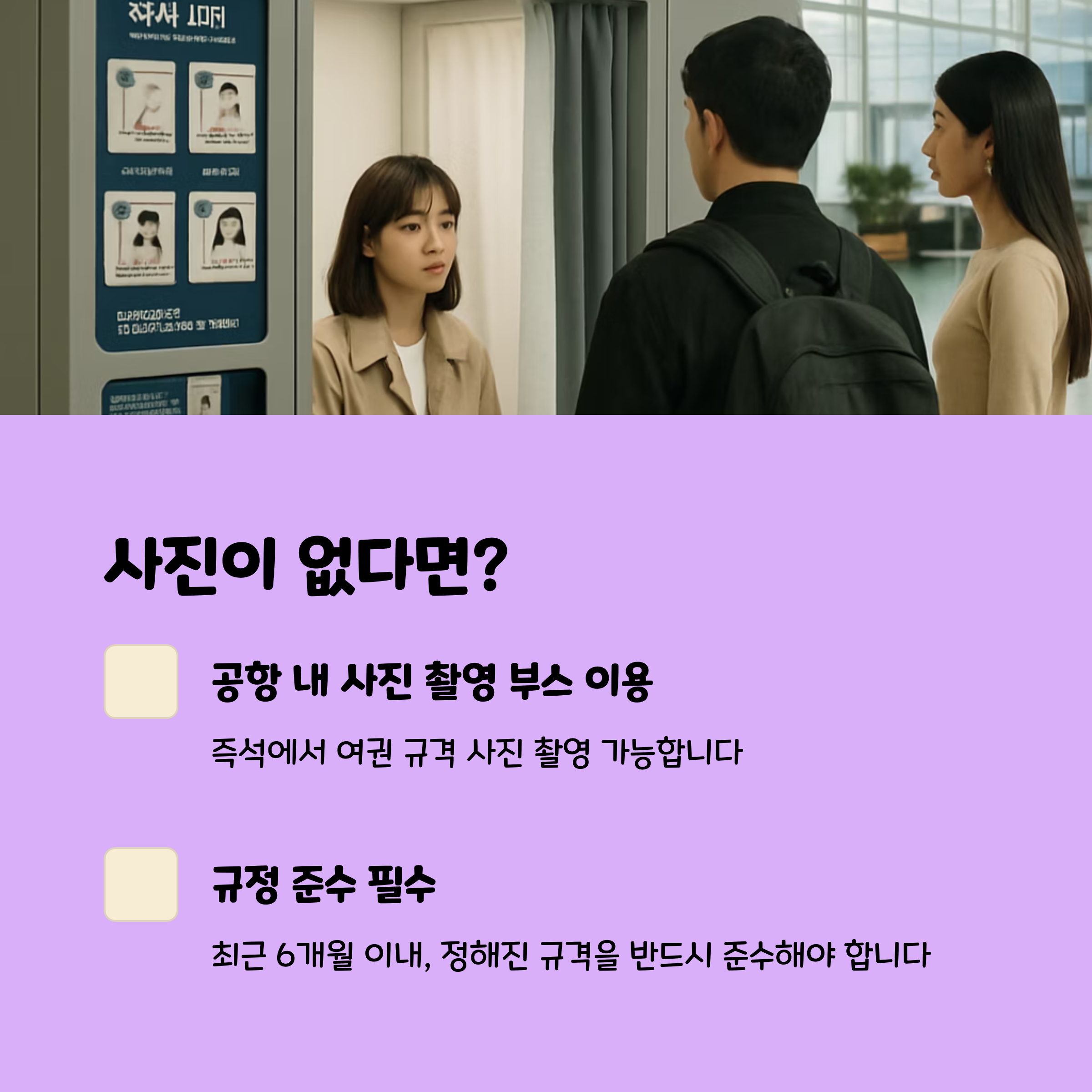 ※ 여권용 사진이 없다면 공항 내 즉석 사진 촬영기를 이용할 수 있습니다.