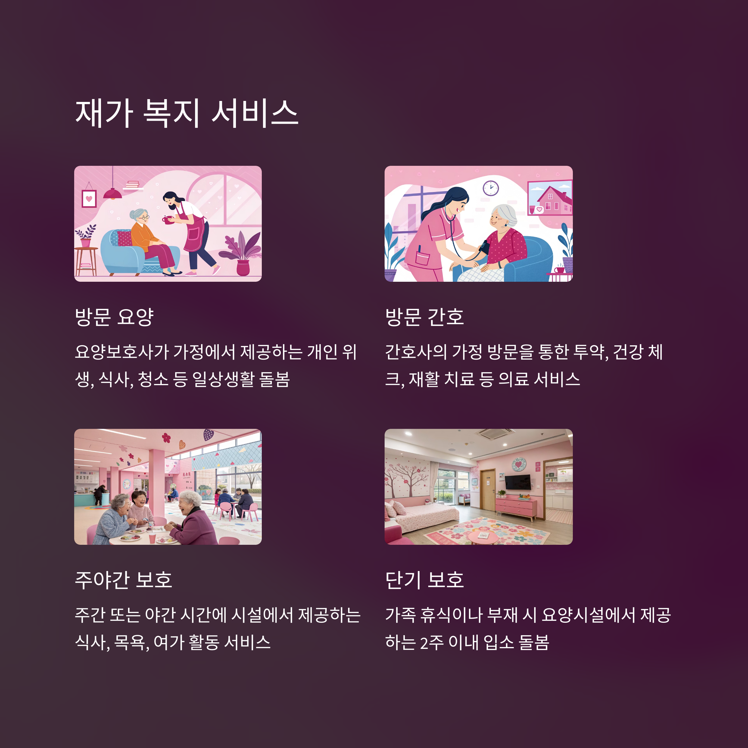 - 재가 복지 서비스: 방문 요양, 방문 간호, 주야간 보호, 단기 보호 서비스 등을 통해 가족 부담 경감