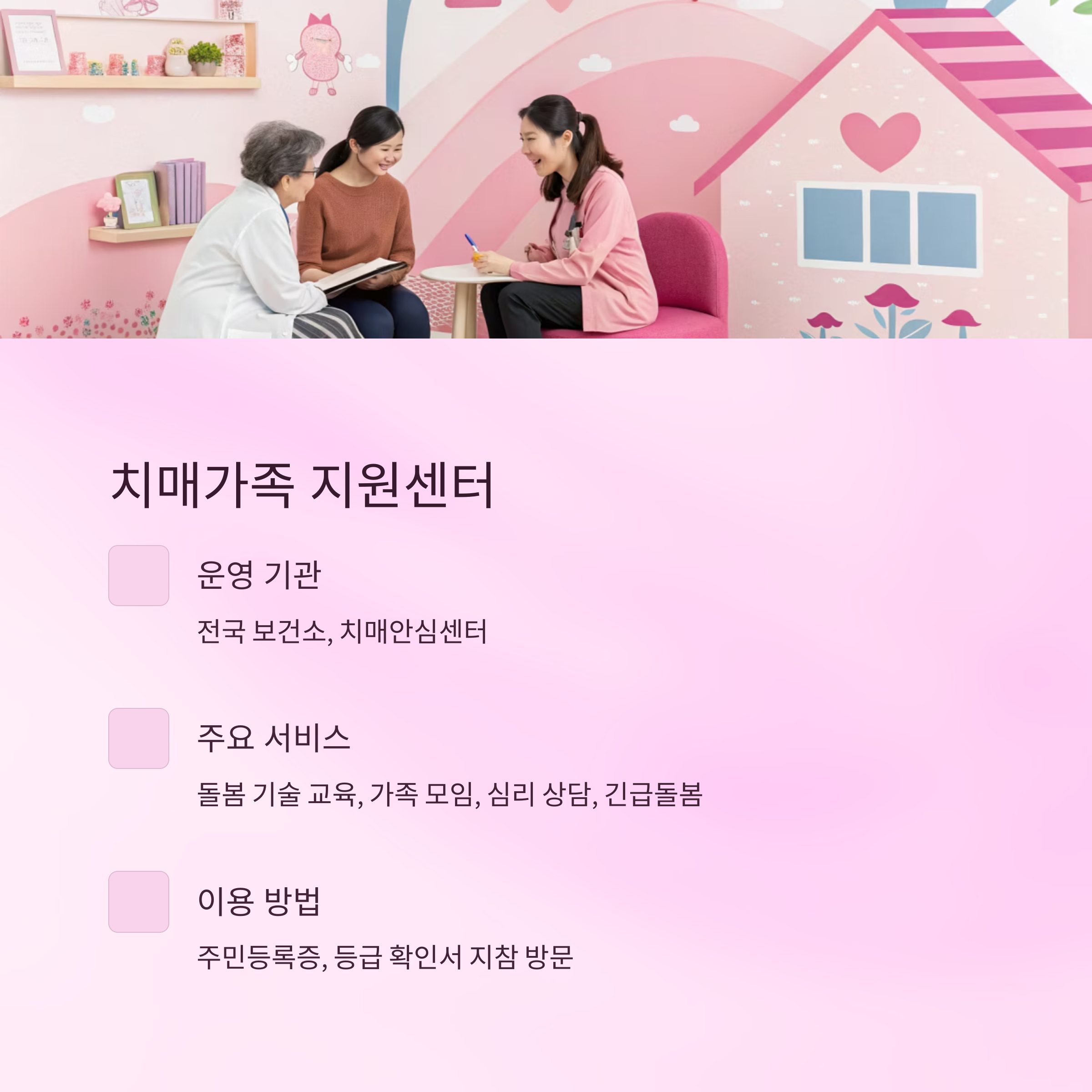 - 치매가족 지원센터: 치매 환자 가족을 위한 상담, 교육, 정서 지원 프로그램 제공