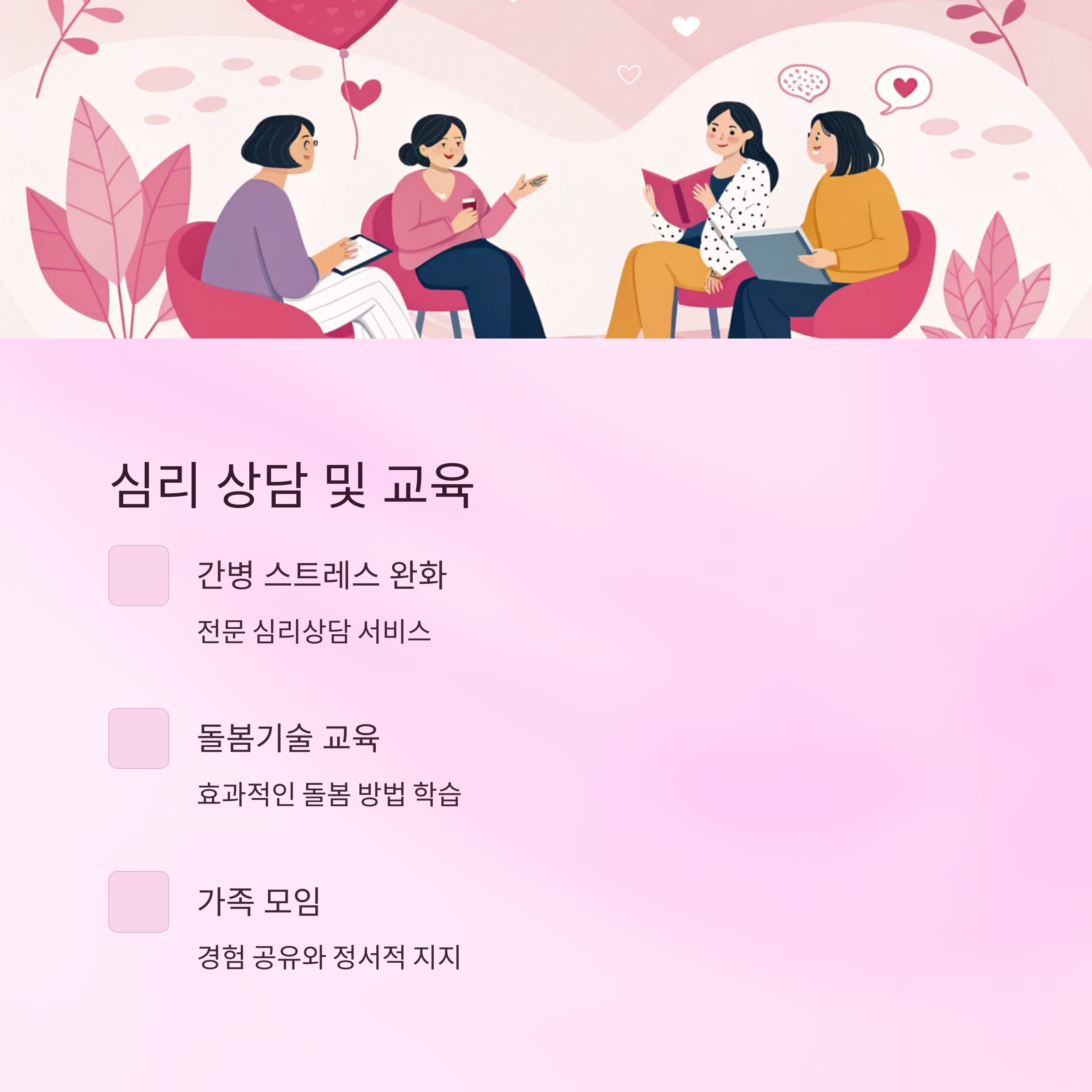 - 심리 상담 및 교육: 간병 스트레스 완화를 위한 가족 심리상담, 돌봄기술 교육