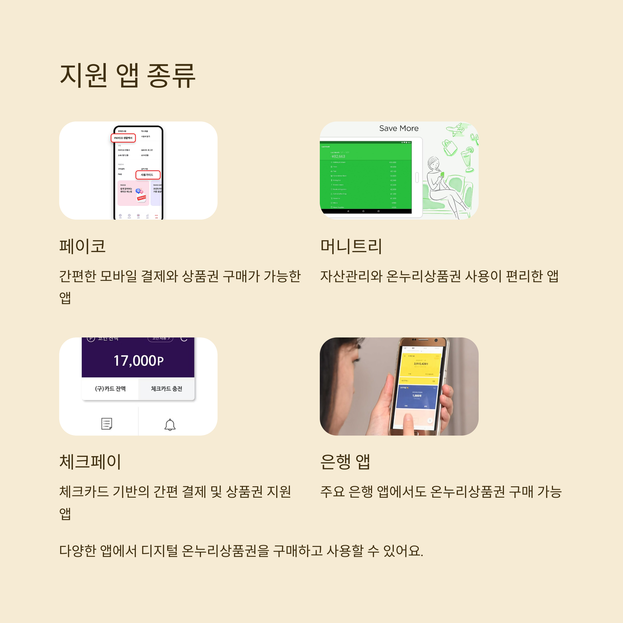 - 지원 앱: 페이코, 머니트리, 체크페이, 은행 앱 등