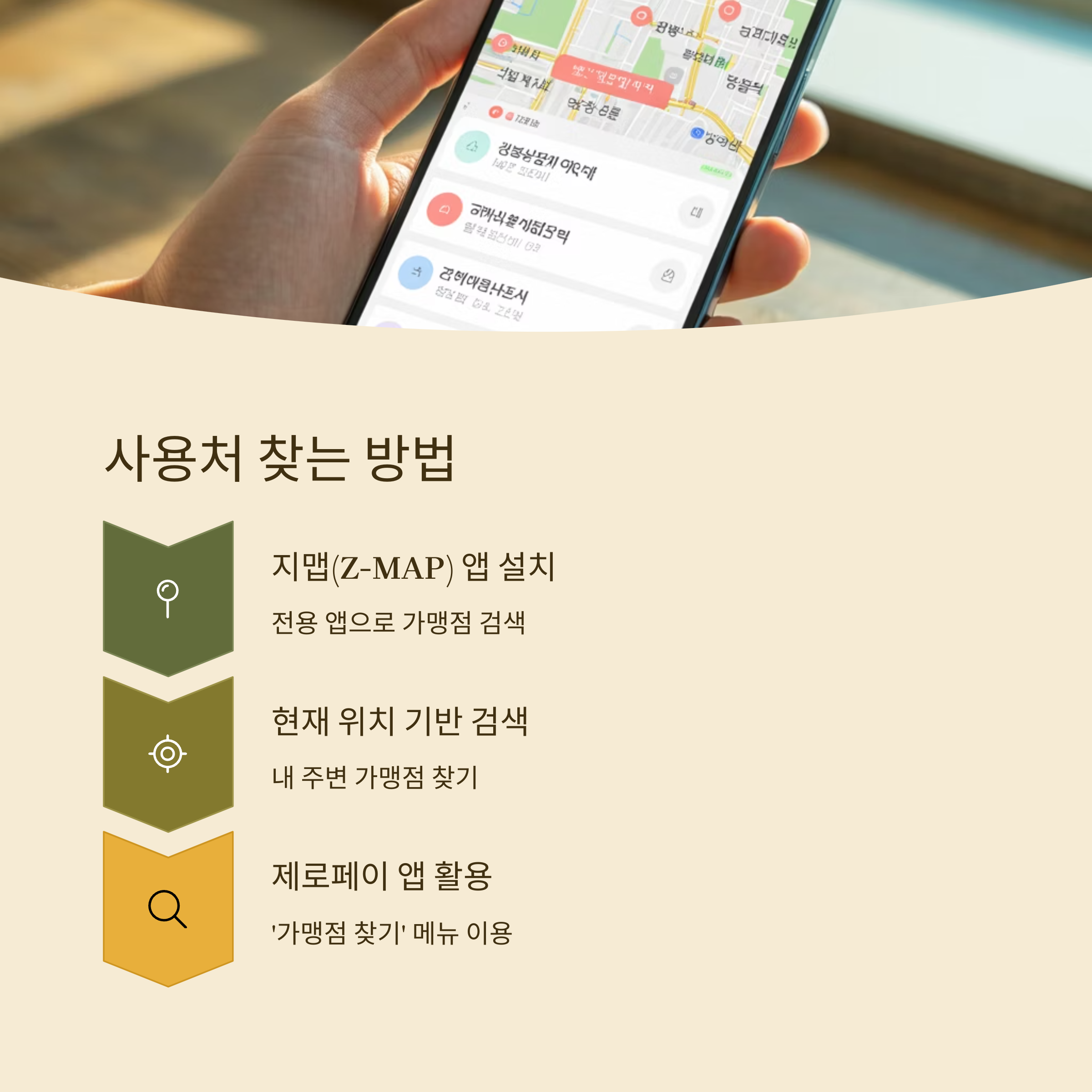 - 지맵(Z-MAP) 앱 설치 → 현재 위치 기반 가맹점 검색