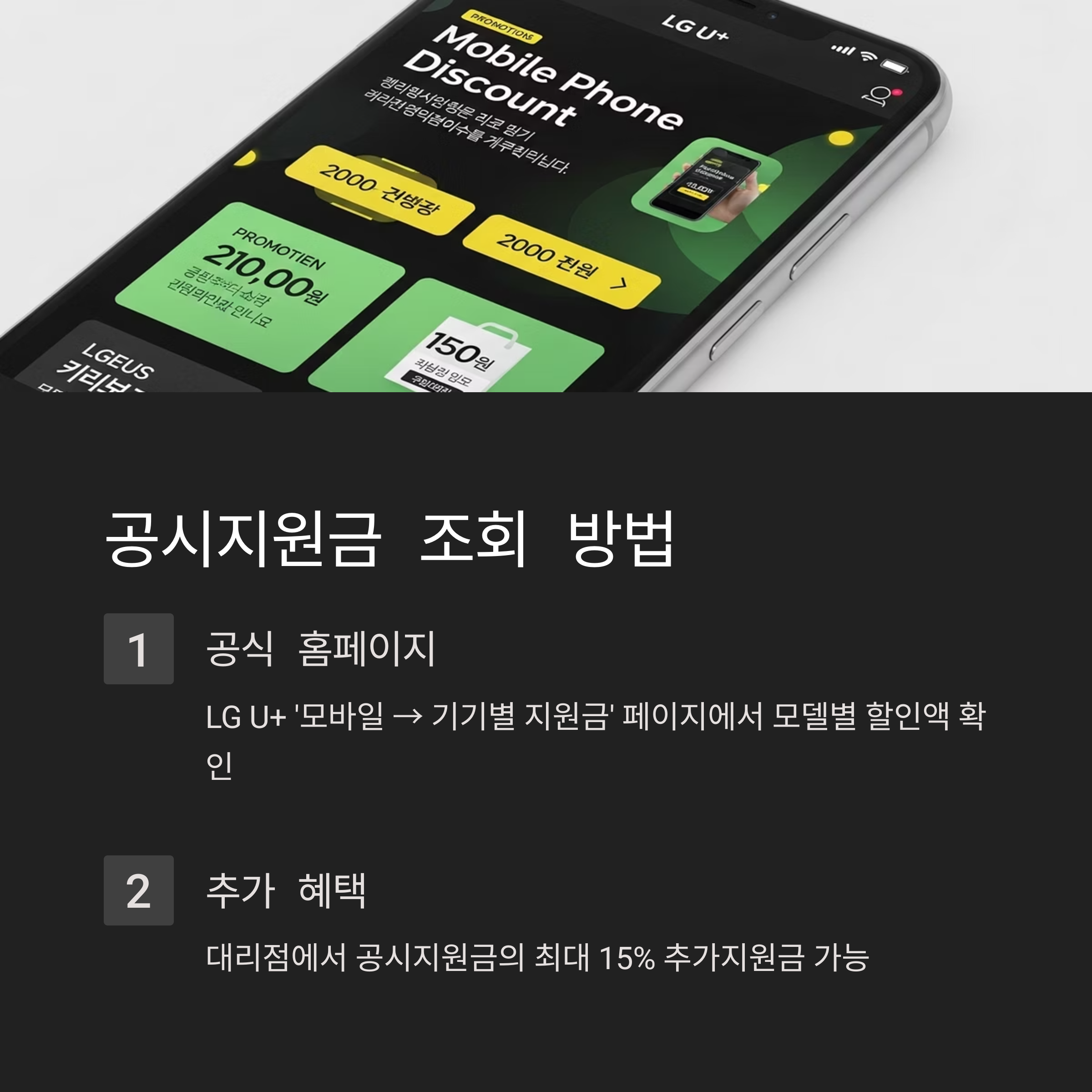 LG U+ 공식 홈페이지 ‘모바일 → 기기별 지원금’ 페이지에서 모델별 공시지원금(휴대폰 가격 할인)을 빠르게 확인할 수 있습니다.