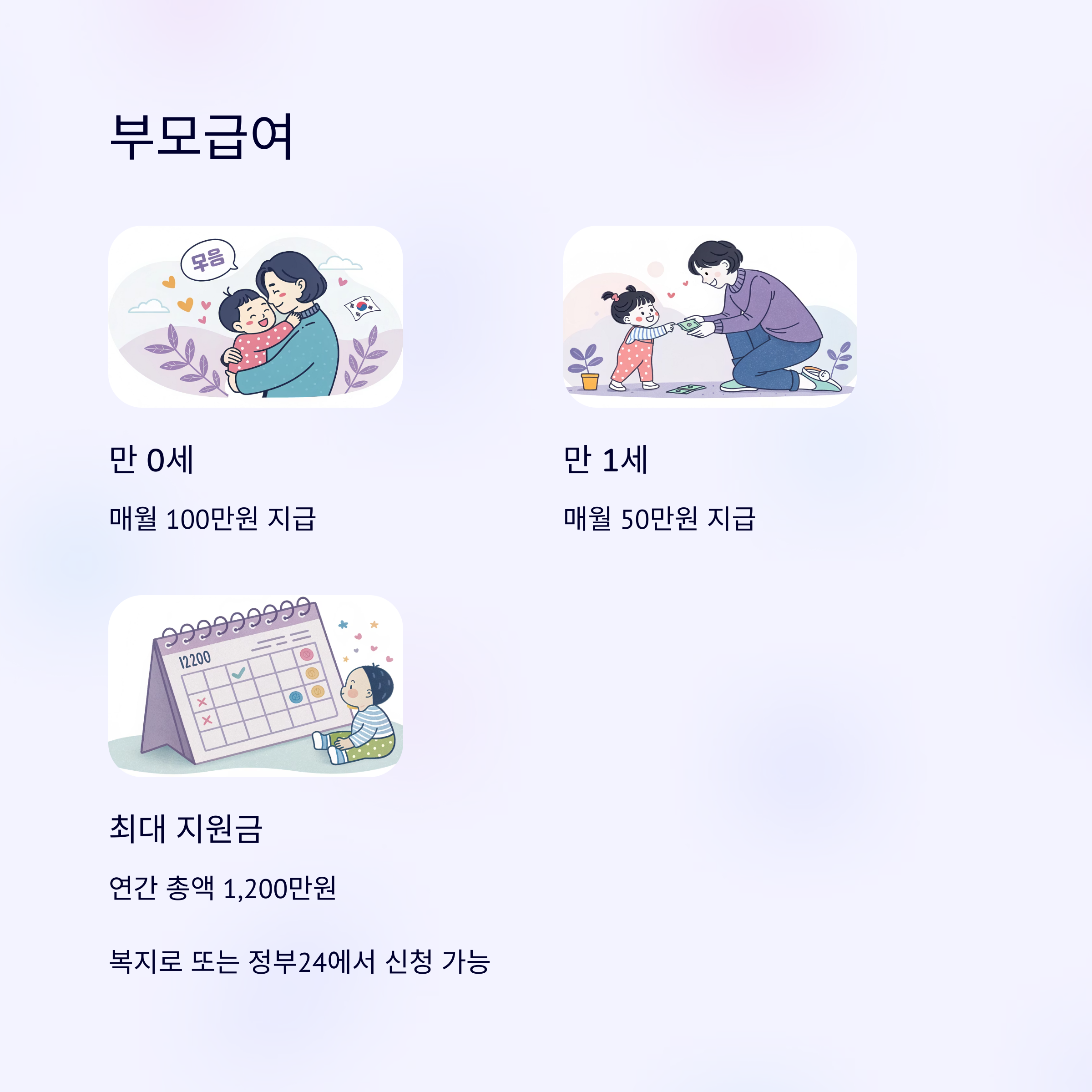 | 부모급여 | 만 0세: 월 100만 원 / 만 1세: 월 50만 원 | 최대 1,200만 원 |