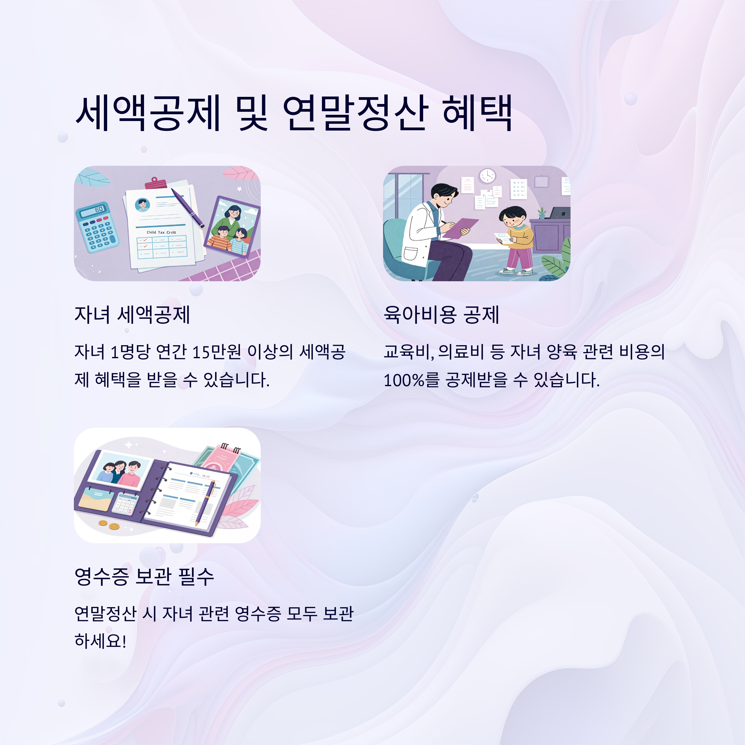 자녀 1명당 연 15만 원 이상 세액공제 + 육아비용 공제 포함.