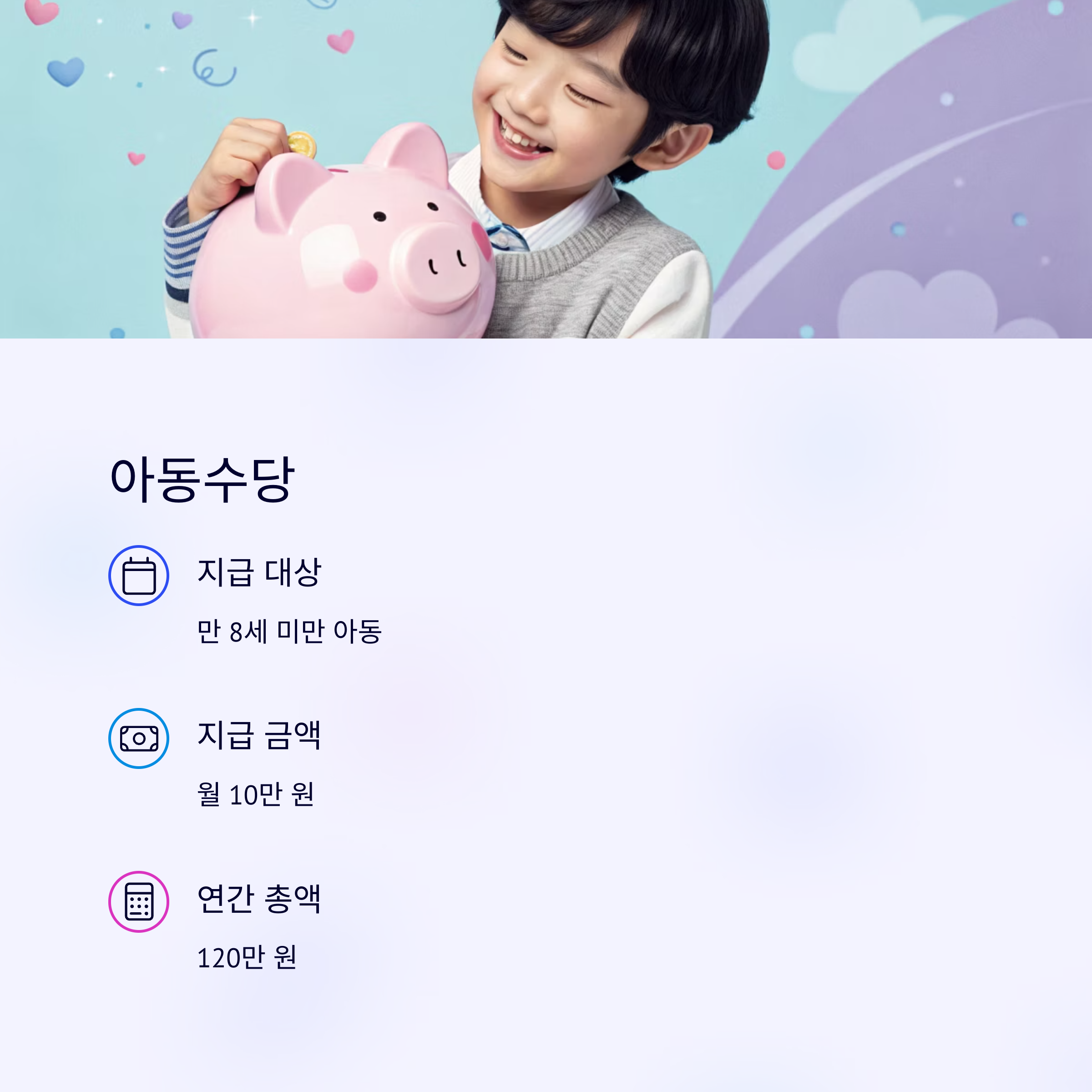 | 아동수당 | 만 8세 미만 아동에게 월 10만 원 지급 | 연간 120만 원 |